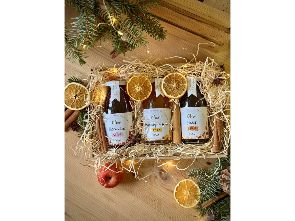 V dárkové krabičce najdete tři 0,25l sirupy, které jisto jistě navodí tu pravou vánoční atmosféru: