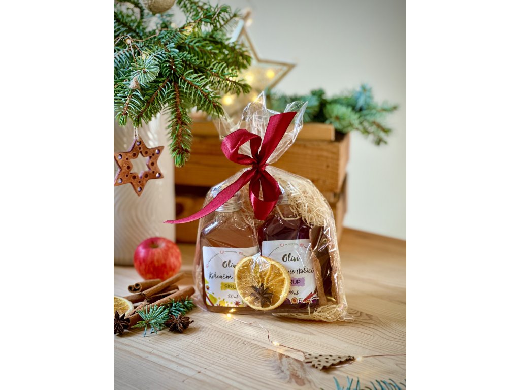 Dárkový balíček - Na zahřátí hruška a višeň obsahuje 2 x 0,1 L zimní sirupy Švestkový sirup se skořicí a Kořeněná hruška.